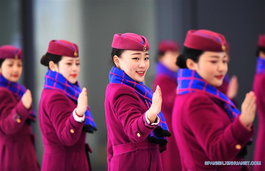 Asistentes de viaje reciben entrenamiento de etiqueta, en Chongqing, en el suroeste de China, el 8 de enero de 2019. Los empleados de la compa?ía China Railway Chengdu Group Co., Ltd. están ocupados preparándose para la temporada alta de viajes del Festival de la Primavera anual, que se espera dure del 21 de enero al 1 de marzo de 2019. (Xinhua/Wang Quanchao)