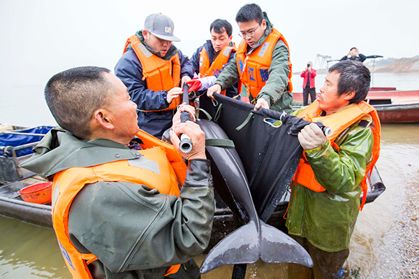Los trabajadores de protección local transportan una marsopa sin aletas desde un lugar de alimentación temporal en un muelle del Lago Poyang en Duchang, provincia de Jiangxi, en marzo. [Foto: Fu Jianbin /China Daily]