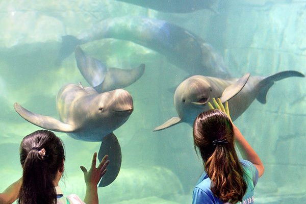 Los visitantes responden a las sonrisas de dos marsopas sin aletas en un acuario de Yichang, provincia de Hubei. [Foto: Liu Shusong/ China Daily]