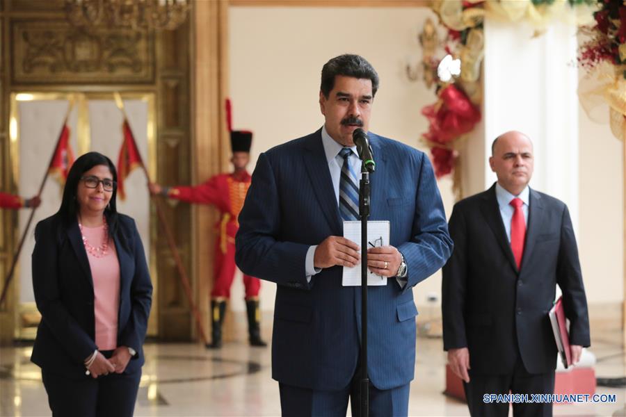 Imagen cedida por la Presidencia de Venezuela del presidente venezolano, Nicolás Maduro (c), realizando declaraciones ante la prensa, en el Palacio de Miraflores, en Caracas, Venezuela, el 7 de enero del 2019. La estatal Petróleos de Venezuela (PDVSA) y la empresa francesa Maurel & Prom firmaron el lunes un convenio por 400 millones de dólares para subir la producción de crudo en un campo del estado de Zulia, informó el presidente venezolano, Nicolás Maduro. (Xinhua/Presidencia de Venezuela)