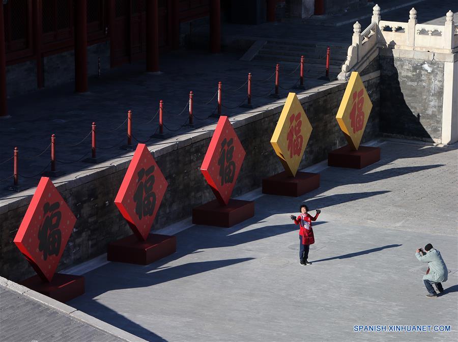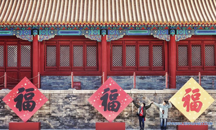 Visitantes posan con el carácter "Fu", que significa buena suerte, en el Museo del Palacio, también conocido como la Ciudad Prohibida, en Beijing, capital de China, el 8 de enero de 2019. El Museo del Palacio presenta la exposición "Celebrado el Festival de la Primavera en la Ciudad Prohibida" para saludar la más importante de todas las fiestas tradicionales. La exposición abrió el martes al público. Cientos de objetos son exhibidos en el museo. (Xinhua/Li Xin)