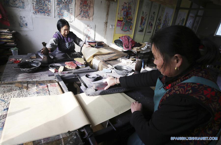 Artistas populares imprimen estampados de A?o Nuevo con bloques de madera en la villa Yangjiabu del distrito Hanting en Weifang, en la provincia de Shandong, en el este de China, el 8 de enero de 2019. Artistas populares locales se ocupan elaborando estampados de A?o Nuevo con bloques de madera para el próximo Festival de la Primavera, el cual comienza el primer día del primer mes del calendario lunar chino, o el 5 de febrero de este a?o. (Xinhua/Zhang Chi)