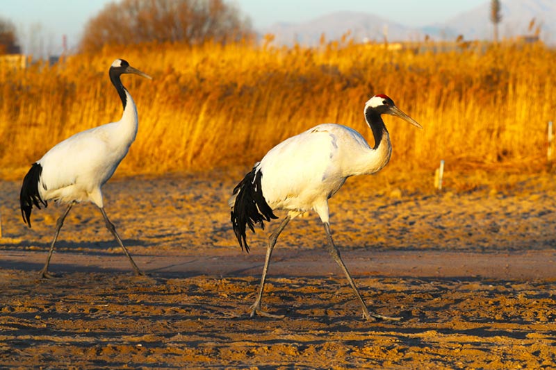 Dos grullas de cabeza roja buscan comida en el Parque Nacional de los Humedales de Zhangye en la ciudad de Zhangye, provincia de Gansu, noroeste de China, el 5 de enero de 2019. [Foto de Cheng Lin para chinadaily.com.cn]