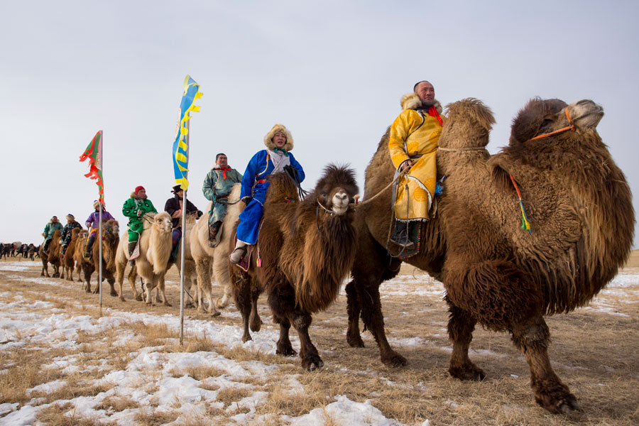 Xiliinhot, Mongolia Interior, 09/01/2019(El Pueblo en Línea) - Pastores vestidos con ropa tradicional de Mongolia montan a camello para participar en el Nadam tradicional de invierno celebrado en Xiliinhot, región autónoma de Mongolia Interior, el 6 de enero de 2019. [Foto por Cui Weiguang / chinadaily.com.cn]