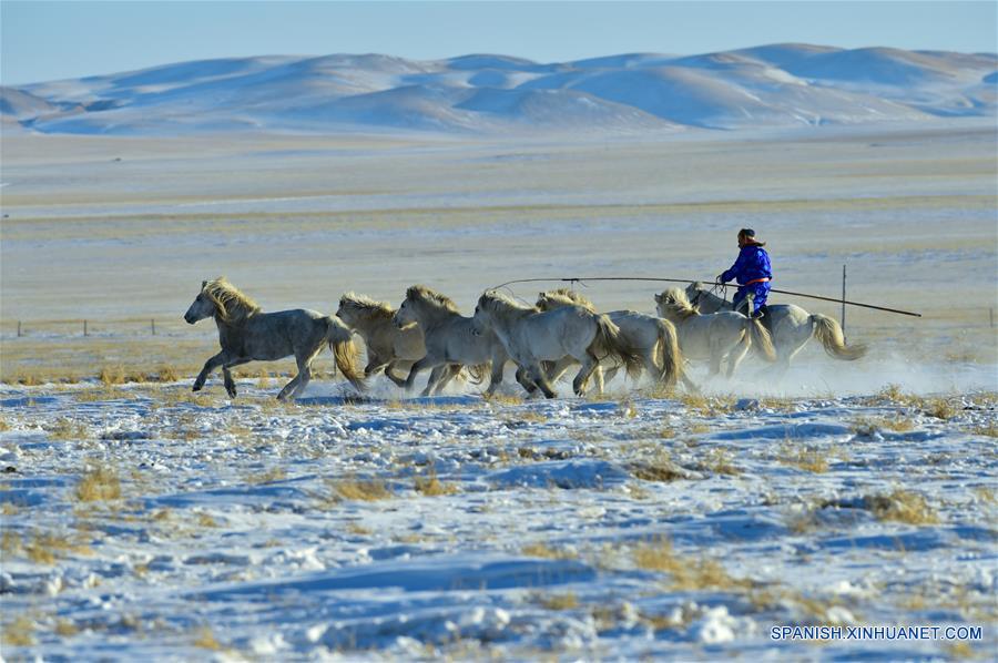 UJIMQIN, enero 8, 2019 (Xinhua) -- Un pastor muestra sus habilidades para lazar caballos en la Bandera Ujimqin Oeste, en la Región Autónoma de Mongolia Interior, en el norte de China, el 8 de enero de 2019. (Xinhua/Zou Yu)