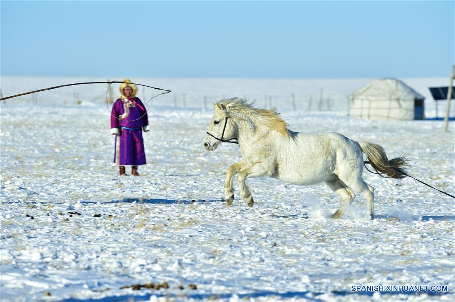 UJIMQIN, enero 8, 2019 (Xinhua) -- Un pastor muestra sus habilidades para lazar caballos en la Bandera Ujimqin Oeste, en la Región Autónoma de Mongolia Interior, en el norte de China, el 8 de enero de 2019. (Xinhua/Zou Yu)
