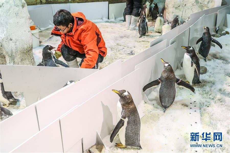El 9 de enero, un cuidador alimenta a las crías de pingüinos de ceja blanca mientras los ejemplares adultos observan, en el parque Ocean World de Dalian, que cuenta con una "guardería" especial que ayuda a las crías de pingüinos a aprender y crecer.