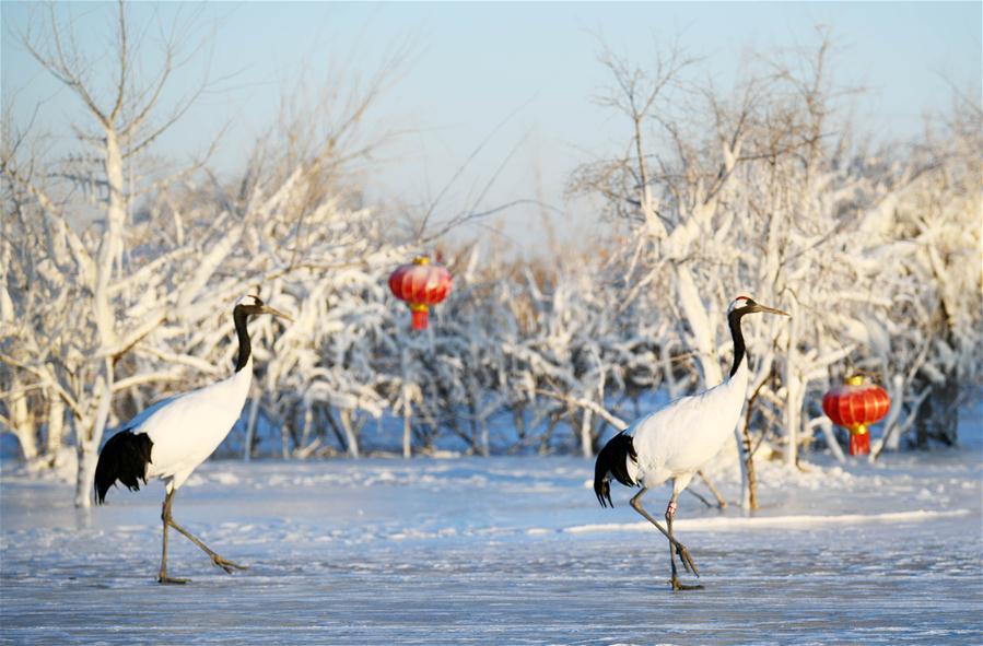 HEILONGJIANG, enero 11, 2019 (Xinhua) -- Imagen del 10 de enero de 2019 de grullas de coronilla roja criadas artificialmente descansando en la Reserva Nacional Natural de Zhalong en Qiqihar, provincia de Heilongjiang, en el noreste de China. La Reserva Nacional Natural de Zhalong sirve como hábitat para más de 190 especies de aves raras como las grullas de coronilla roja. (Xinhua/Wang Jianwei)
