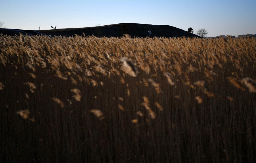 HEILONGJIANG, enero 11, 2019 (Xinhua) -- Imagen del 10 de enero de 2019 de grullas de coronilla roja criadas artificialmente descansando en la Reserva Nacional Natural de Zhalong en Qiqihar, provincia de Heilongjiang, en el noreste de China. La Reserva Nacional Natural de Zhalong sirve como hábitat para más de 190 especies de aves raras como las grullas de coronilla roja. (Xinhua/Wang Jianwei)