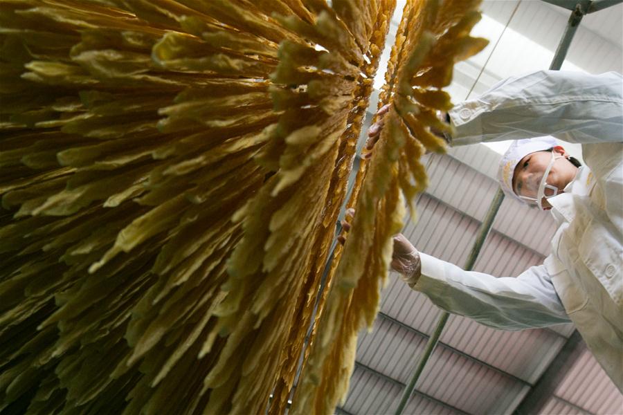 GUIZHOU, enero 11, 2019 (Xinhua) -- Imagen del 10 de enero de 2019 de una empleada trabajando en una fábrica de alimentos de soja, en el municipio de Xiaotun del condado de Dafang en Bijie, provincia de Guizhou, en el suroeste de China. Las plantas de procesamiento de alimentos de soja se encuentran ocupadas en los últimos días para satisfacer la demanda del mercado previo al Festival de Primavera, que se celebra el 5 de febrero este a?o. (Xinhua/Luo Dafu)