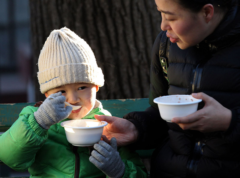 Los visitantes y turistas saborea las gachas de Laba en el templo Yonghe, Beijing, 13 de enero del 2019. [Foto: Zhang Wei/ China Daily]