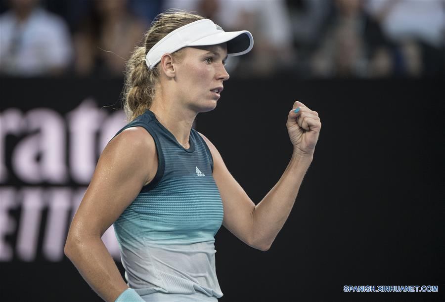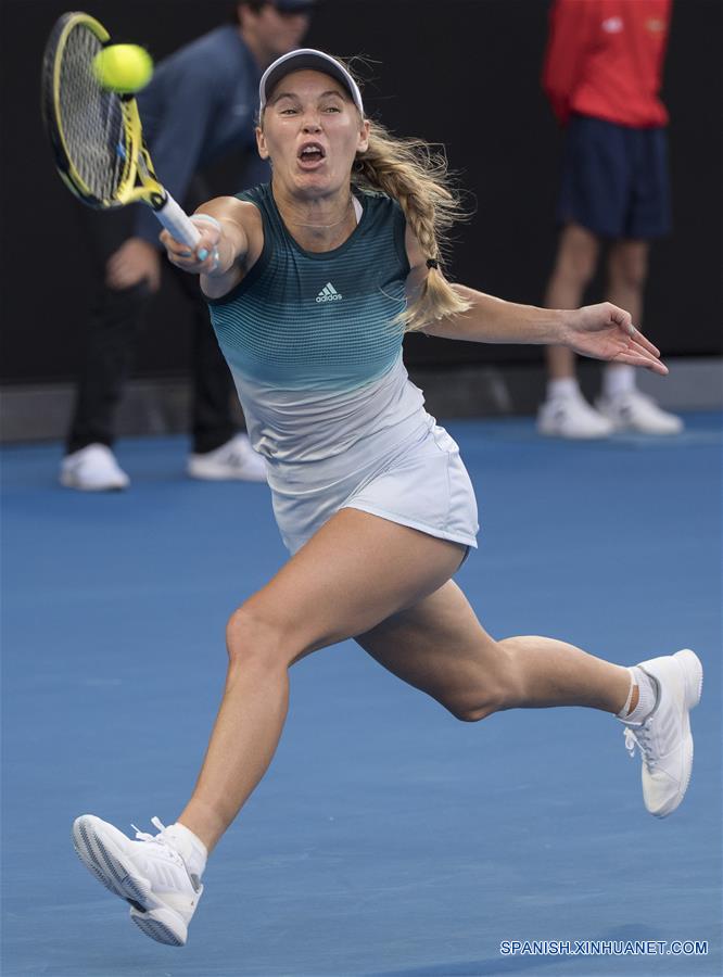 MELBOURNE, enero 14, 2019 (Xinhua) -- Caroline Wozniacki, de Dinamarca, devuelve la pelota a Alison van Uytvanck, de Bélgica, durante el partido femenil individual de primera ronda del Torneo de Tenis Abierto de Australia 2019, en Melbourne, Australia, el 14 de enero de 2019. Caroline Wozniacki ganó el encuentro. (Xinhua/Lui Siu Wai)