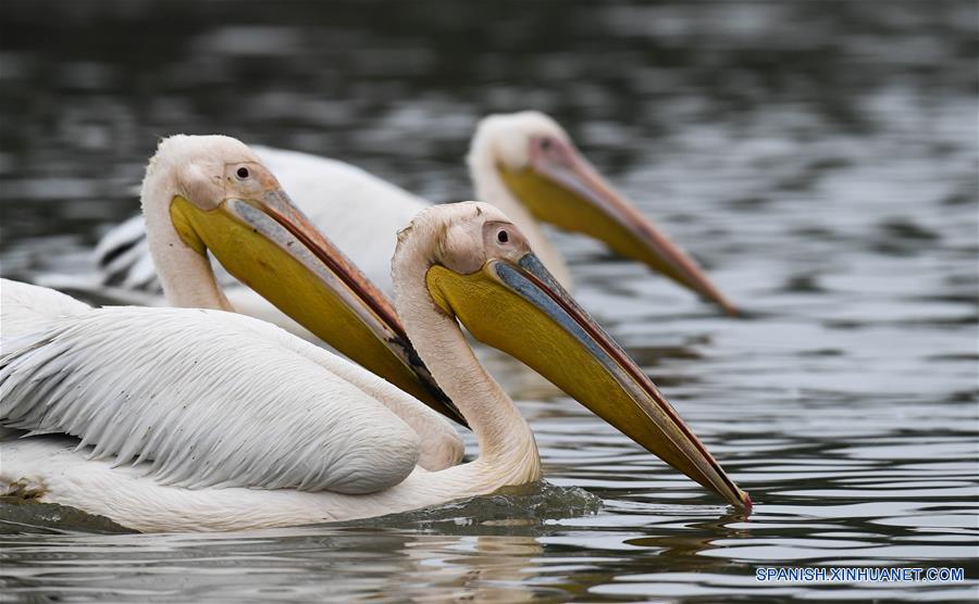 HAINAN, enero 16, 2019 (Xinhua) -- Pelícanos nadan en un estanque de peces, en la villa de Dingwen del condado de Longquan en Haikou, capital de la provincia de Hainan, en el sur de China, el 16 de enero de 2019. (Xinhua/Yang Guanyu)