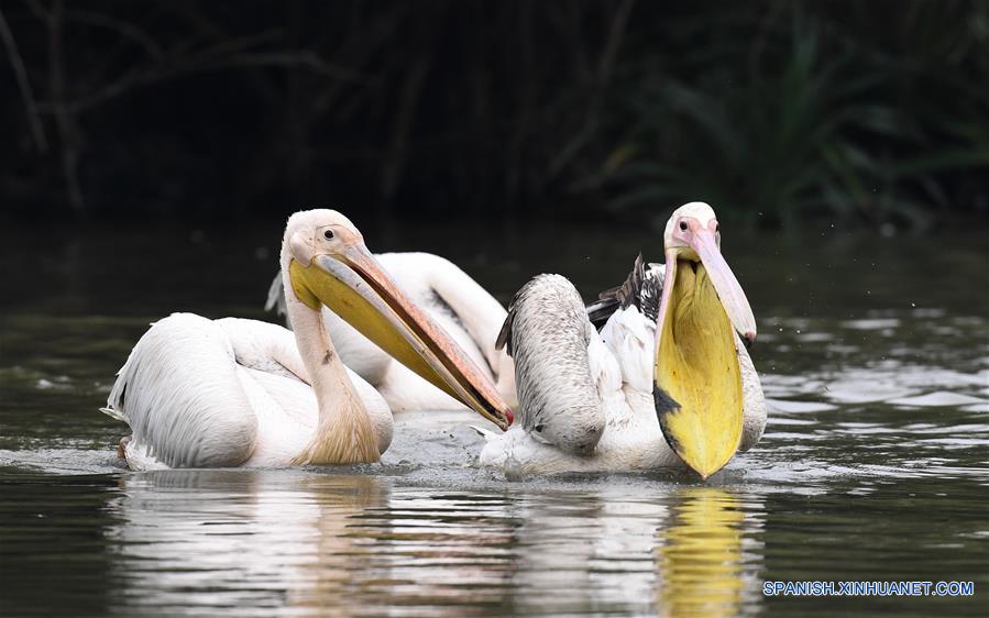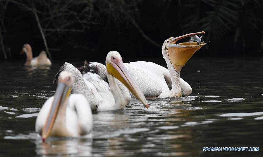 HAINAN, enero 16, 2019 (Xinhua) -- Pelícanos se alimentan en un estanque de peces, en la villa de Dingwen del condado de Longquan en Haikou, capital de la provincia de Hainan, en el sur de China, el 16 de enero de 2019. (Xinhua/Yang Guanyu)