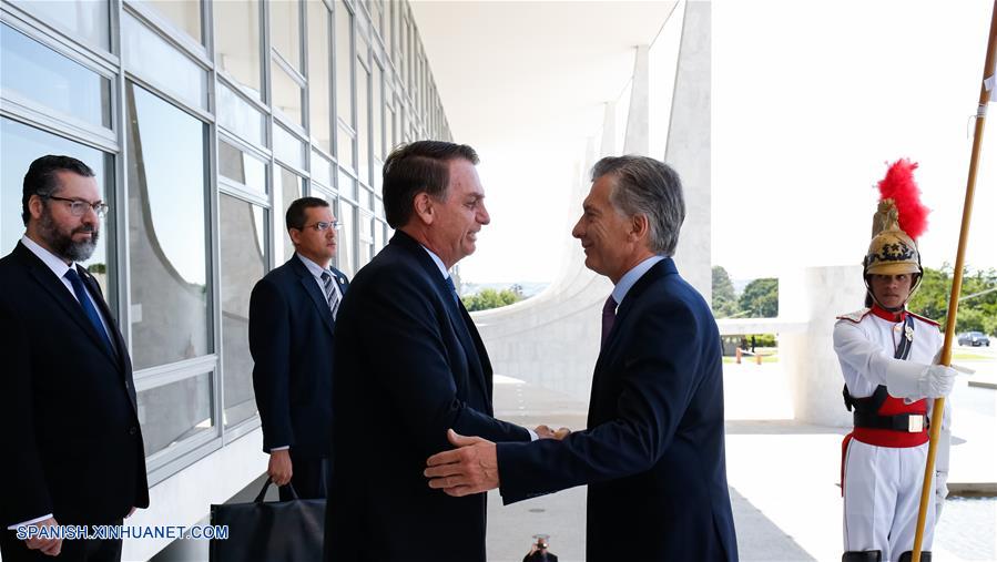 BRASILIA, enero 16, 2019 (Xinhua) -- Imagen cedida por la Presidencia de Brasil, del presidente brasile?o, Jair Bolsonaro (3-i), recibiendo al presidente de Argentina, Mauricio Macri (2-d), en el Palacio de Planalto en Brasilia, Brasil, el 16 de enero de 2019. Los presidentes de Brasil, Jair Bolsonaro, y de Argentina, Mauricio Macri, resaltaron el miércoles tras un encuentro en Brasilia, la fuerte convergencia de valores entre sus gobiernos. Ambos mandatarios resaltaron también la necesidad de fortalecer la economía de los dos países y la intención de "modernizar" el Mercado Común del Sur (Mercosur), cuyos países fundadores son Argentina, Brasil, Paraguay y Uruguay. (Xinhua/Alan Santos/Presidencia de Brasil)
