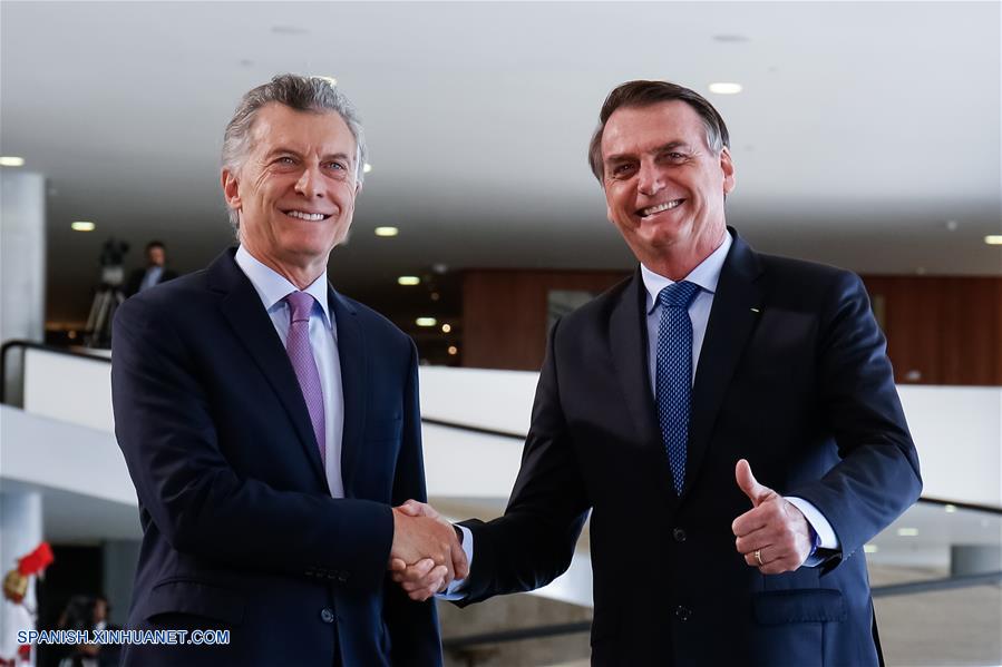 BRASILIA, enero 16, 2019 (Xinhua) -- Imagen cedida por la Presidencia de Brasil, del presidente brasile?o, Jair Bolsonaro (d), estrechando la mano con el presidente de Argentina, Mauricio Macri (i), en el Palacio de Planalto en Brasilia, Brasil, el 16 de enero de 2019. Los presidentes de Brasil, Jair Bolsonaro, y de Argentina, Mauricio Macri, resaltaron el miércoles tras un encuentro en Brasilia, la fuerte convergencia de valores entre sus gobiernos. Ambos mandatarios resaltaron también la necesidad de fortalecer la economía de los dos países y la intención de "modernizar" el Mercado Común del Sur (Mercosur), cuyos países fundadores son Argentina, Brasil, Paraguay y Uruguay. (Xinhua/Alan Santos/Presidencia de Brasil)