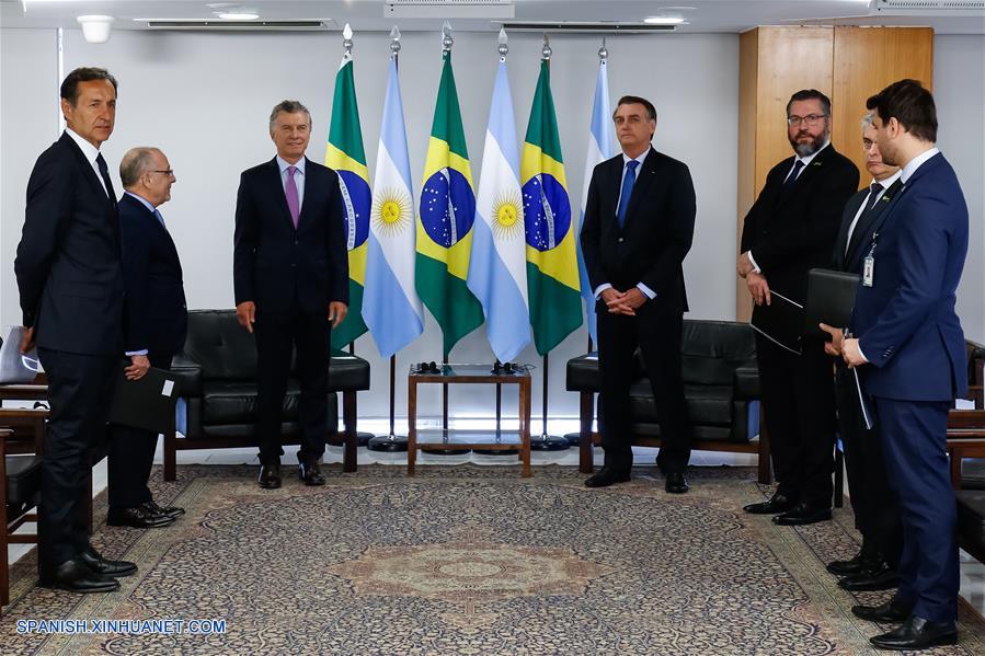 BRASILIA, enero 16, 2019 (Xinhua) -- Imagen cedida por la Presidencia de Brasil, del presidente brasile?o, Jair Bolsonaro (4-d), reuniéndose con presidente de Argentina, Mauricio Macri (3-i), en el Palacio de Planalto en Brasilia, Brasil, el 16 de enero de 2019. Los presidentes de Brasil, Jair Bolsonaro, y de Argentina, Mauricio Macri, resaltaron el miércoles tras un encuentro en Brasilia, la fuerte convergencia de valores entre sus gobiernos. Ambos mandatarios resaltaron también la necesidad de fortalecer la economía de los dos países y la intención de "modernizar" el Mercado Común del Sur (Mercosur), cuyos países fundadores son Argentina, Brasil, Paraguay y Uruguay. (Xinhua/Alan Santos/Presidencia de Brasil)