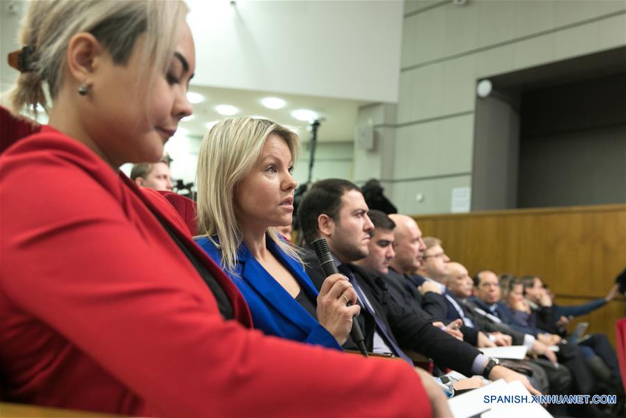 MOSCU, enero 16, 2019 (Xinhua) -- Una periodista formula una pregunta durante la conferencia de prensa anual del ministro de Relaciones Exteriores de Rusia, Sergei Lavrov, en Moscú, Rusia, el 16 de enero de 2019. (Xinhua/Bai Xueqi)