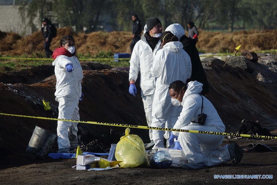 Personal del Servicio Médico Forene trabaja en el sitio de una explosión, en el municipio de Tlahuelilpan, estado de Hidalgo, México, el 19 de enero de 2019. La explosión e incendio en una toma clandestina en un ducto de hidrocarburos la víspera en el central estado mexicano de Hidalgo acumula un saldo de 66 personas fallecidas y 76 heridas, informaron el sábado las autoridades. El gobernador de Hidalgo, Omar Fayad, dijo que el saldo todavía era preliminar porque muchas personas se encontraban debatiéndose entre "la vida y la muerte", a consecuencia del percance ocurrido la tarde-noche del viernes en el municipio de Tlahuelilpan. (Xinhua/Carolina Endara)