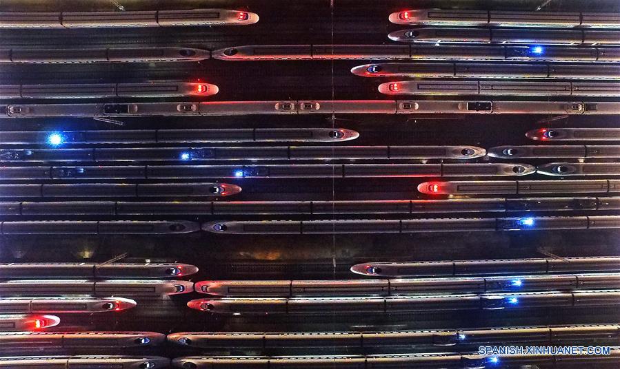NANCHANG, enero 20, 2019 (Xinhua) -- Vista aérea de trenes de alta velocidad luego del mantenimiento, en Nanchang, capital de la provincia de Jianxi, en el este de China, el 20 de enero de 2019. El pico de viajes por el Festival de Primavera 2019, conocido como Chunyun, dará inicio el 21 de enero. El Festival de Primavera, o A?o Nuevo Lunar chino, se celebra el 5 de febrero este a?o. (Xinhua/Wan Xiang)