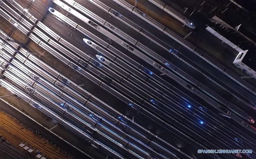 NANCHANG, enero 20, 2019 (Xinhua) -- Vista aérea de trenes de alta velocidad luego del mantenimiento, en Nanchang, capital de la provincia de Jianxi, en el este de China, el 20 de enero de 2019. El pico de viajes por el Festival de Primavera 2019, conocido como Chunyun, dará inicio el 21 de enero. El Festival de Primavera, o A?o Nuevo Lunar chino, se celebra el 5 de febrero este a?o. (Xinhua/Wan Xiang)
