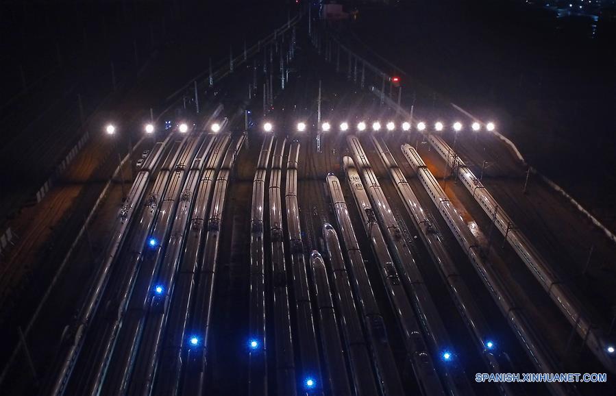 NANCHANG, enero 20, 2019 (Xinhua) -- Vista aérea de trenes de alta velocidad luego del mantenimiento, en Nanchang, capital de la provincia de Jianxi, en el este de China, el 20 de enero de 2019. El pico de viajes por el Festival de Primavera 2019, conocido como Chunyun, dará inicio el 21 de enero. El Festival de Primavera, o A?o Nuevo Lunar chino, se celebra el 5 de febrero este a?o. (Xinhua/Wan Xiang)
