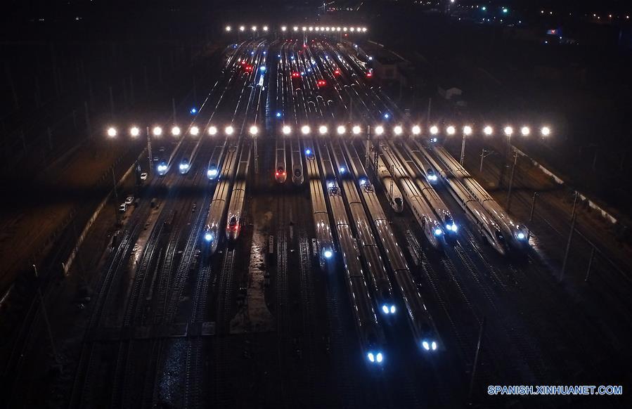 NANCHANG, enero 20, 2019 (Xinhua) -- Vista aérea de trenes de alta velocidad luego del mantenimiento, en Nanchang, capital de la provincia de Jianxi, en el este de China, el 20 de enero de 2019. El pico de viajes por el Festival de Primavera 2019, conocido como Chunyun, dará inicio el 21 de enero. El Festival de Primavera, o A?o Nuevo Lunar chino, se celebra el 5 de febrero este a?o. (Xinhua/Wan Xiang)