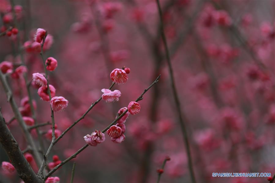 GUIZHOU, enero 20, 2019 (Xinhua) -- Vista de flores de ciruelo durante el periodo solar denominado Gran Frío (Dahan) en el calendario lunar chino, en el parque humedal de Dexi en Bijie, en la provincia de Guizhou, en el suroeste de China, el 20 de enero de 2019. (Xinhua/Han Xianpu)