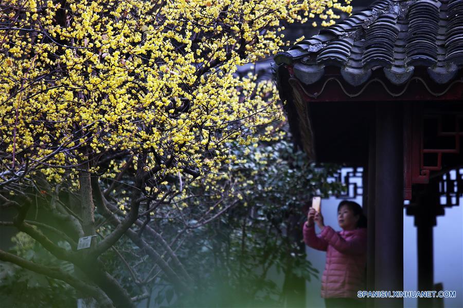 JIANGSU, enero 20, 2019 (Xinhua) -- Personas observan "flores de invierno" o chimonanthus durante el periodo solar denominado Gran Frío (Dahan) en el calendario lunar chino, en el Parque Jingchuan en Changzhou, provincia de Jiangsu, en el este de China, el 20 de enero de 2019. (Xinhua/Chen Wei)