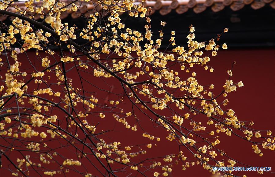 JIANGSU, enero 20, 2019 (Xinhua) -- Vista de "flores de invierno" o chimonanthus durante el periodo solar denominado Gran Frío (Dahan) en el calendario lunar chino, en el sitio escénico del Mausoleo Xiaoling de la Dinastía Ming en Nanjing, capital de la provincia de Jiangsu, en el este de China, el 20 de enero de 2019. (Xinhua/Liu Jianhua)