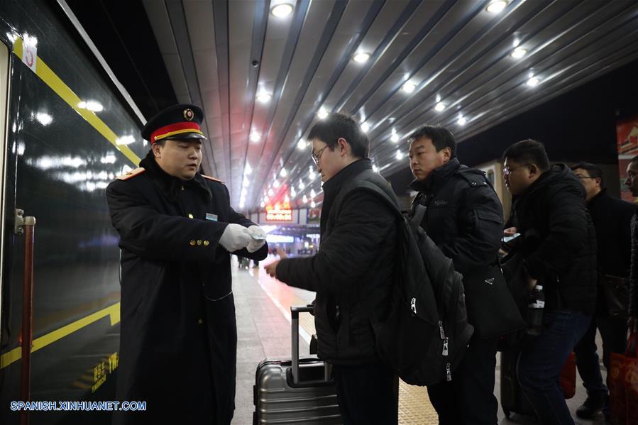 BEIJING, enero 2O, 2019 (Xinhua) -- Un trabajador revisa el boleto de un pasajero del tren K4051 hacia la ciudad de Nantong, provincia de Jiangsu, en el este de China, en la Estación de Ferrocarril de Beijing, durante el primer día del frenesí de viajes por el Festival de Primavera, en Beijing, capital de China, el 20 de enero de 2019. Millones de chinos regresan a sus pueblos natales cada a?o para celebrar el A?o Nuevo Lunar, o Festival de Primavera, formando así la temporada alta del Festival de Primavera. El Festival de Primavera, o A?o del Cerdo en el calendario lunar chino, empezará el 5 de febrero de 2019. Los 40 días del frenesí de viajes por el Festival de Primavera empieza el 21 de enero, en el que se espera que se realicen 3 billones de viajes. (Xinhua/Xing Guangli)