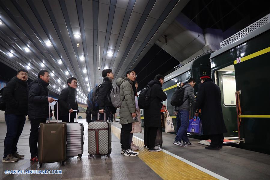 BEIJING, enero 2O, 2019 (Xinhua) -- Pasajeros se forman para abordar el tren K4051 hacia la ciudad de Nantong, provincia de Jiangsu, en el este de China, en la Estación de Ferrocarril de Beijing, durante el primer día del frenesí de viajes por el Festival de Primavera, en Beijing, capital de China, el 20 de enero de 2019. Millones de chinos regresan a sus pueblos natales cada a?o para celebrar el A?o Nuevo Lunar, o Festival de Primavera, formando así la temporada alta del Festival de Primavera. El Festival de Primavera, o A?o del Cerdo en el calendario lunar chino, empezará el 5 de febrero de 2019. Los 40 días del frenesí de viajes por el Festival de Primavera empieza el 21 de enero, en el que se espera que se realicen 3 billones de viajes. (Xinhua/Xing Guangli)