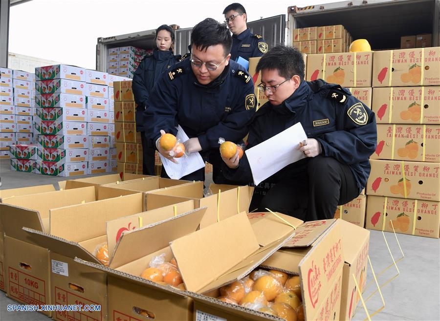 FUJIAN, enero 20, 2019 (Xinhua) -- Policías de aduana revisan cajas con fruta proveniente de Taiwán, en el sureste de China, de donde zarparon en un carguero, a un puerto en Pingtan, en la provincia de Fujian, en el sureste de China, el 20 de enero de 2019. Un barco con más de 700 toneladas de cargamento llegó a un puerto en Pingtan el domingo despúés de que una ruta directa de carga marítima abrió el sábado, entre Kaohsiung, Taiwán, en el sureste de China y Pingtan. (Xinhua/Jiang Kehong)