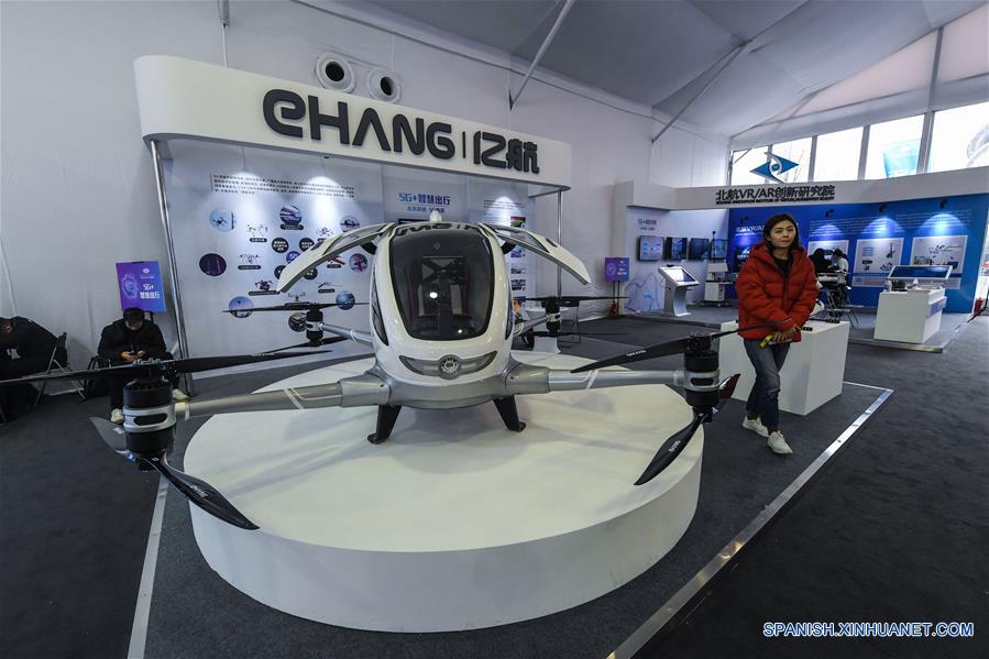 Una aeronave automática basada en tecnología 5G es exhibida en una exposición de tecnología 5G, en Hangzhou, provincia de Zhejiang, en el este de China, el 19 de enero de 2019. (Xinhua/Xu Yu)