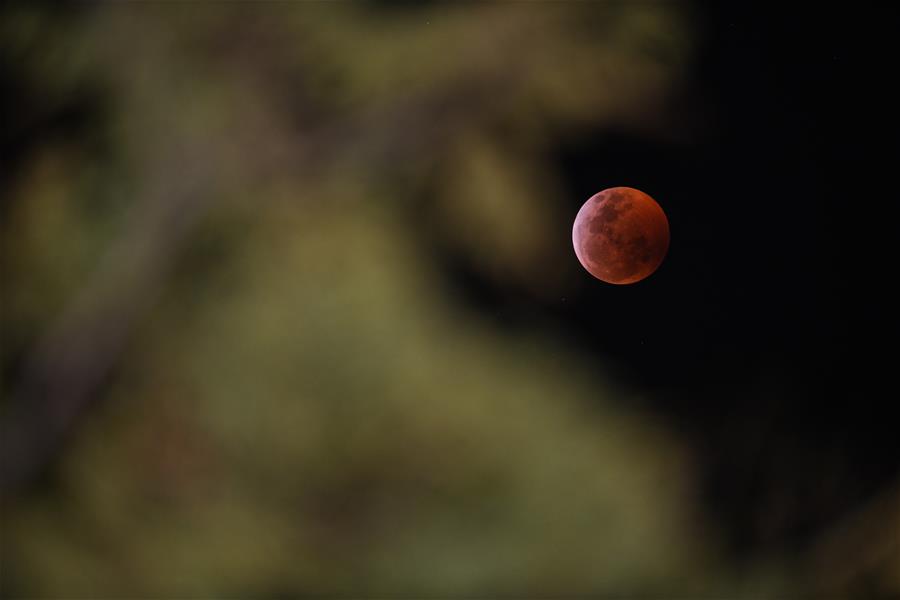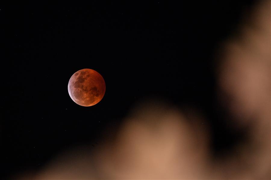 CIUDAD DE MEXICO, enero 21, 2019 (Xinhua) -- Imagen del 20 de enero de 2019 de la luna durante el eclipse total de Luna también llamado "Luna de Sangre" en la Ciudad de México, capital de México. (Xinhua/César Vicu?a)