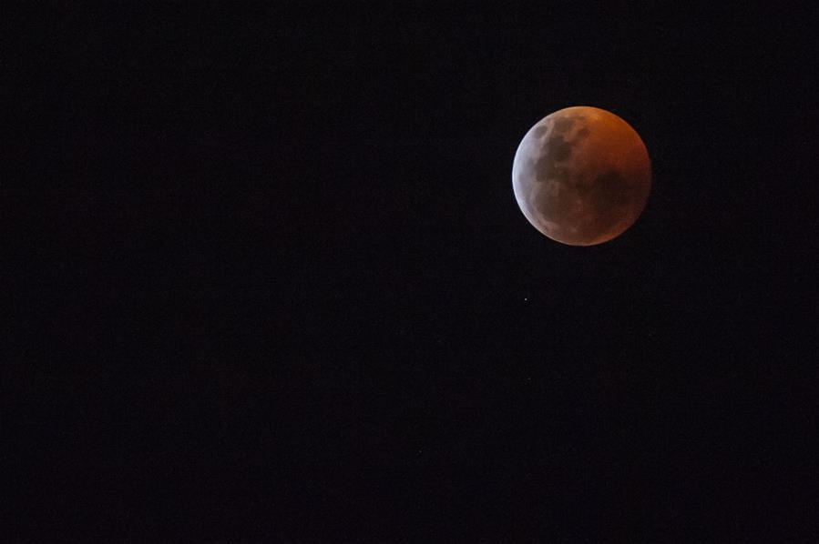 (CIUDAD DE MEXICO, enero 21, 2019 (Xinhua) -- Imagen del 20 de enero de 2019 de la luna durante el eclipse total de Luna también llamado "Luna de Sangre" en la Ciudad de México, capital de México. (Xinhua/César Vicu?a)