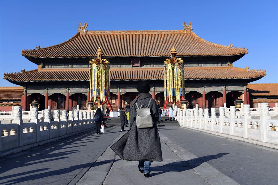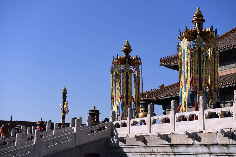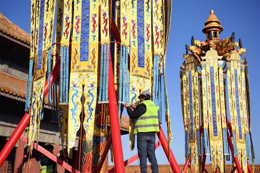 BEIJING, enero 21, 2019 (Xinhua) -- Linternas de la longevidad son instaladas antes del Qianqing Gong, o el Palacio de la Pureza Celestial, en el Museo del Palacio, también conocido como la Ciudad Prohibida, en Beijing, capital de China, el 21 de enero de 2019. Las linternas tradicionales recuperadas por el Museo del Palacio, de acuerdo con los archivos de la Dinastía Qing (1644-1911), serán abiertas para el público el lunes, como parte de la exposición "Celebrando el Festival de Primavera en la Ciudad Prohibida". (Xinhua/Jin Liangkuai)