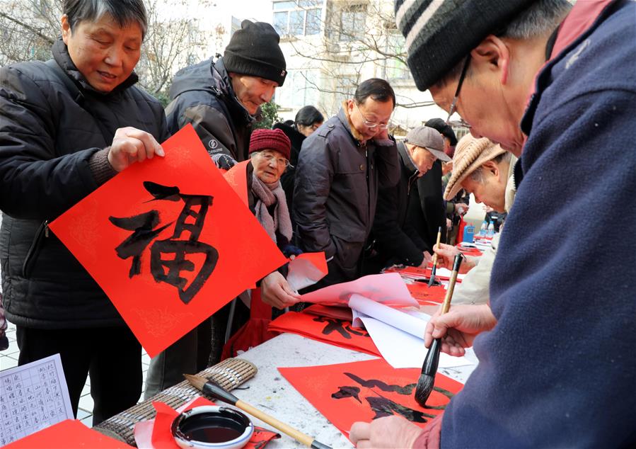 JIANGSU, enero 22, 2019 (Xinhua) -- Entusiastas de la caligrafía escriben el carácter chino Fu, o felicidad en espa?ol, en una comunidad en la ciudad de Suzhou, provincia de Jiangsu, en el este de China, el 22 de enero de 2019. Las personas en China tienen la tradición de pegar versos pareados rojos para dar la bienvenida al Festival de Primavera, o A?o Nuevo Lunar chino, que se celebra el 5 de febrero este a?o. (Xinhua/Hang Xingwei)