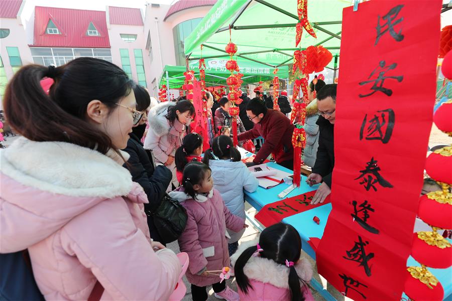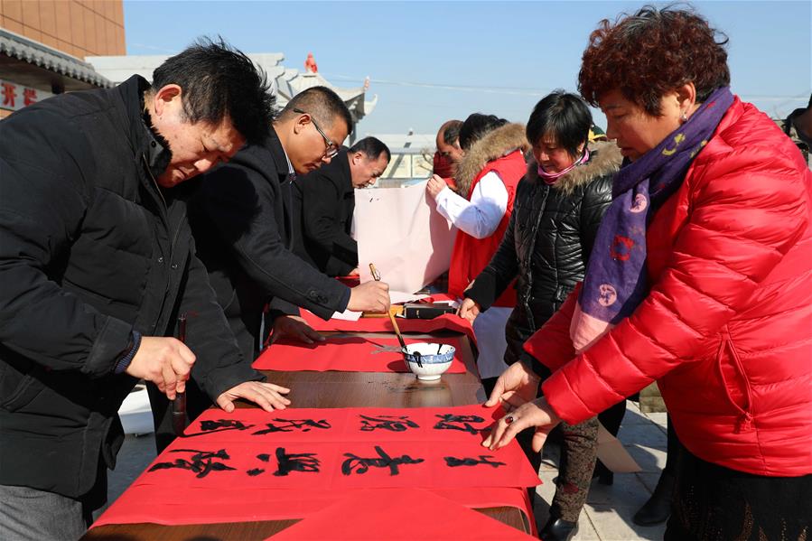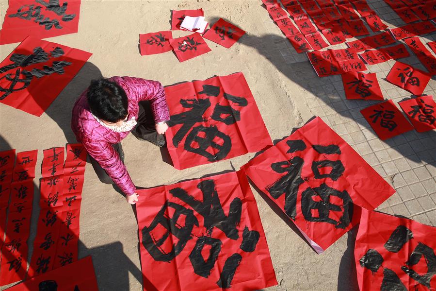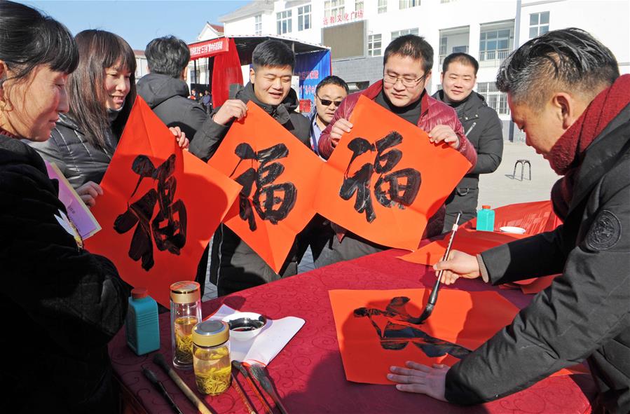 ANHUI, enero 22, 2019 (Xinhua) -- Entusiastas de la caligrafía escriben el carácter chino Fu, o felicidad en espa?ol, en la villa de Jianglixin de la ciudad de Bozhou, provincia de Anhui, en el este de China, el 22 de enero de 2019. Las personas en China tienen la tradición de pegar versos pareados rojos para dar la bienvenida al Festival de Primavera, o A?o Nuevo Lunar chino, que se celebra el 5 de febrero este a?o. (Xinhua/Zhang Yanlin)
