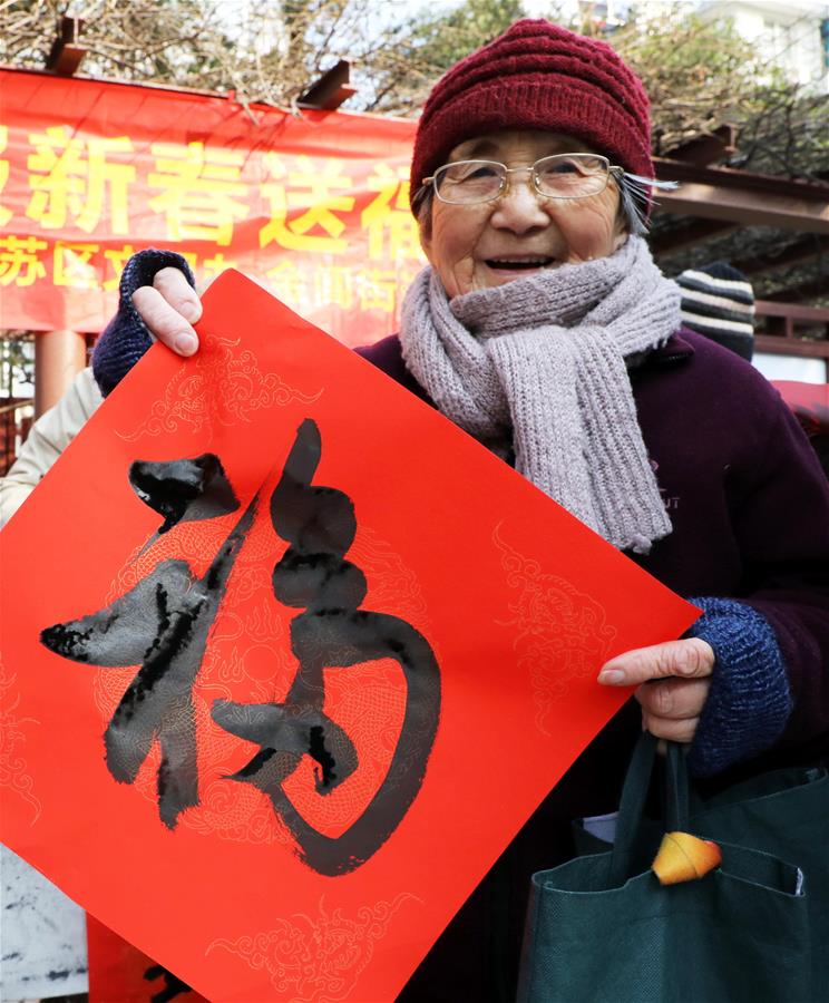 JIANGSU, enero 22, 2019 (Xinhua) -- Una mujer mayor muestra el carácter chino Fu, o felicidad en espa?ol, en una comunidad en la ciudad de Suzhou, provincia de Jiangsu, en el este de China, el 22 de enero de 2019. Las personas en China tienen la tradición de pegar versos pareados rojos para dar la bienvenida al Festival de Primavera, o A?o Nuevo Lunar chino, que se celebra el 5 de febrero este a?o. (Xinhua/Hang Xingwei)