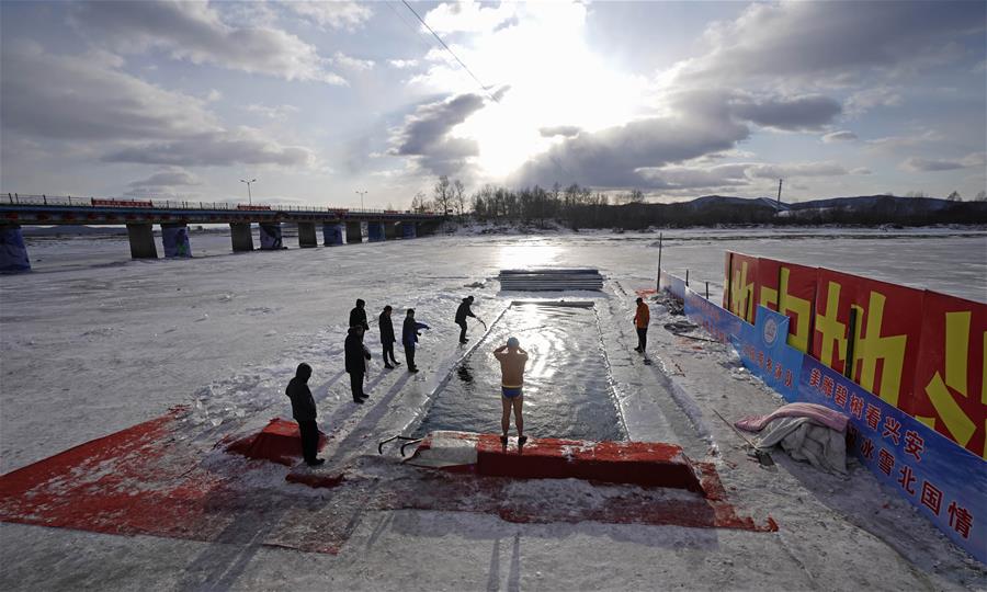 HEILONGJIANG, enero 22, 2019 (Xinhua) -- Un miembro del Club de Natación de Invierno Oso Polar Norte se prepara para salta al Río Ganhe en Jagdaqi, en la provincia Heilongjiang, en el noreste de China, el 22 de enero de 2019. Jagdaqi, ubicado en el noreste de la provincia de Heilongjiang y parte en el este de las Grandes Monta?as Khingan, experimenta clima frío en invierno. El Club de Natación de Invierno Oso Polar Norte local, establecido en 1998, continúa entrenando cada invierno a pesar de la baja temperatura. Actualmente son 92 miembros y 15 de ellos son mujeres que aman nadar en invierno. (Xinhua/Cai Yang)
