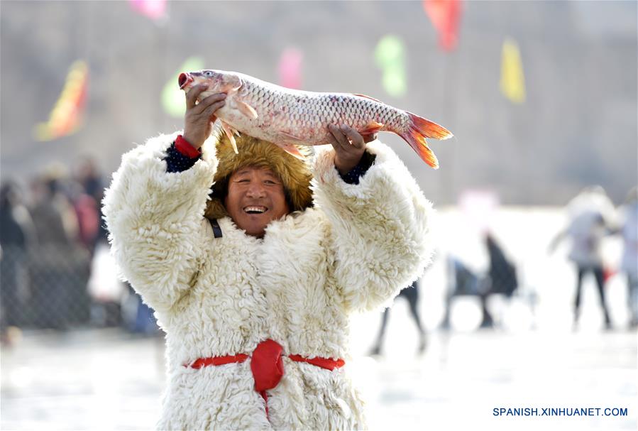 HOHHOT, enero 26, 2019 (Xinhua) -- Un heredero del patrimonio de la pesca de invierno del Lago Chagan exhibe un pescado recién atrapado en la Reserva Qianyaozi en Hohhot, capital de la Región Autónoma de Mongolia Interior, en el norte de China, el 26 de enero de 2019. Un festival turístico de pesca de invierno de dos días abrió en Hohhot el sábado, en el cual 18 herederos de la pesca de invierno del Lago Chagan mostraron a visitantes las formas tradicionales de pesca. La pesca de invierno en el Lago Chagan cubierto de hielo se remonta a las dinastías Liao y Jin, del siglo X al siglo XIII, en China y fue listado como patrimonio cultural intangible nacional en 2008. (Xinhua/Wang Zheng)