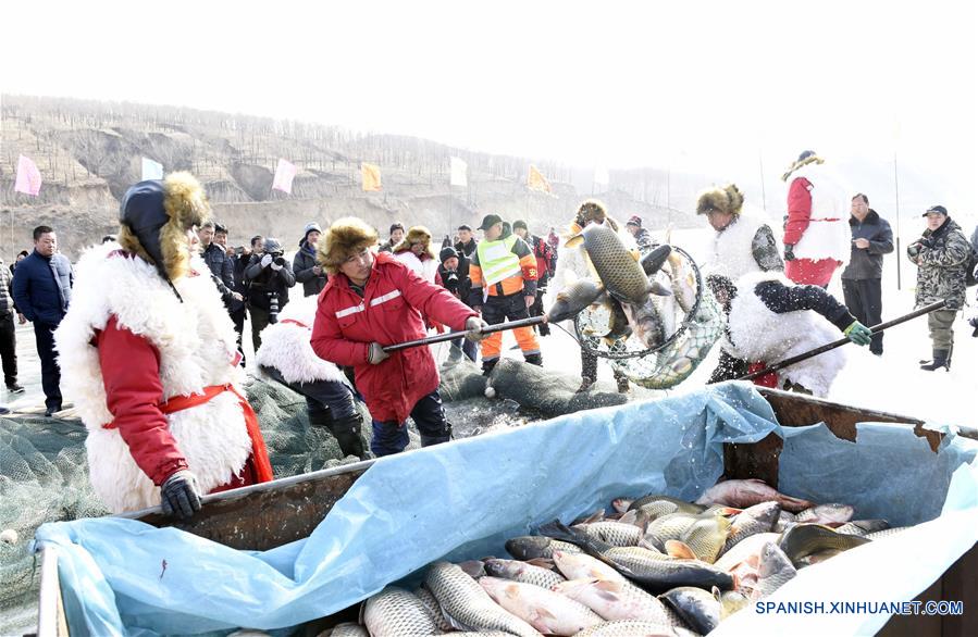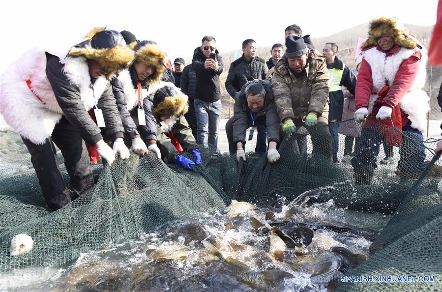 HOHHOT, enero 26, 2019 (Xinhua) -- Herederos del patrimonio de la pesca de invierno del Lago Chagan jalan una red de pesca en la Reserva Qianyaozi en Hohhot, capital de la Región Autónoma de Mongolia Interior, en el norte de China, el 26 de enero de 2019. Un festival turístico de pesca de invierno de dos días abrió en Hohhot el sábado, en el cual 18 herederos de la pesca de invierno del Lago Chagan mostraron a visitantes las formas tradicionales de pesca. La pesca de invierno en el Lago Chagan cubierto de hielo se remonta a las dinastías Liao y Jin, del siglo X al siglo XIII, en China y fue listado como patrimonio cultural intangible nacional en 2008. (Xinhua/Wang Zheng)