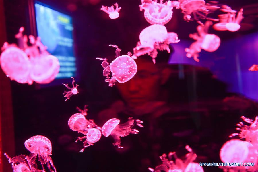 GUIZHOU, enero 27, 2019 (Xinhua) -- Imagen del 26 de enero de 2019 de una persona observando medusas en un acuario en Guiyang, capital de la provincia de Guizhou, en el suroeste de China. (Xinhua/Han Xianpu)