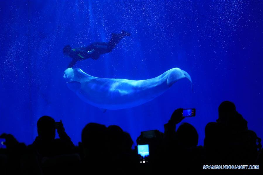 GUIZHOU, enero 27, 2019 (Xinhua) -- Imagen del 26 de enero de 2019 de personas observando una ballena beluga en un acuario en Guiyang, capital de la provincia de Guizhou, en el suroeste de China. (Xinhua/Wang Chunliang)