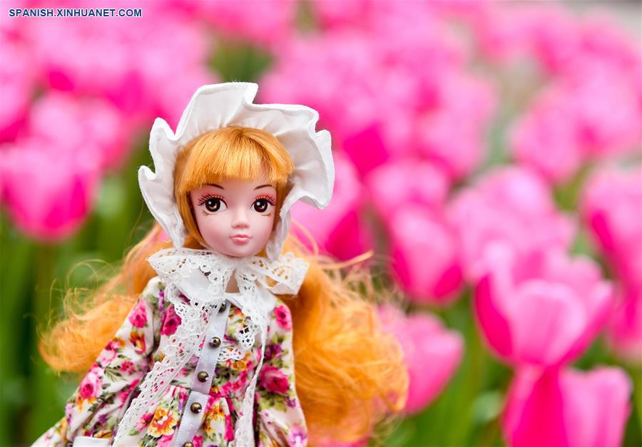 GUANGDONG, enero 28, 2019 (Xinhua) -- Una mu?eca es exhibida durante una muestra de tulipanes en un jardín en la zona de libre comercio de Nansha, en la provincia de Guangdong, en el sur de China, el 28 de enero de 2019. Más de 30 variedades de tulipanes traídos del Jardín Keukenhof de Países Bajos fueron exhibidos recientemente. (Xinhua/Liu Dawei)