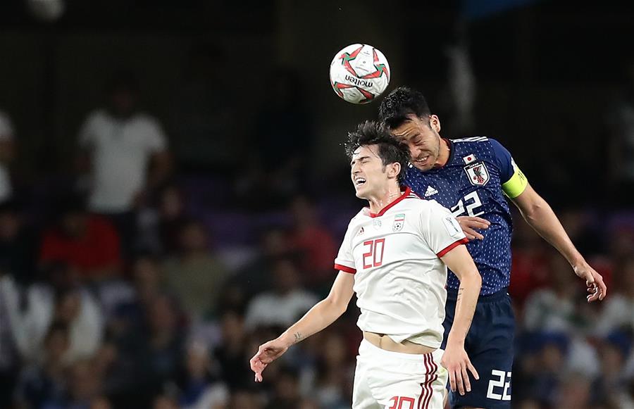 AL AIN, enero 28, 2019 (Xinhua) -- El jugador Sardar Azmoun (i), de Irán, disputa el balón con Mayu Yoshida (d), de Japón durante el partido correspondiente a la semifinal de la Copa Asiática 2019 de la Confederación Asiática de Fútbol (AFC, por sus siglas en inglés), celebrado en el Estadio Hazza Bin Zayed, en Al Ain, Emiratos Arabes Unidos (EAU), el 28 de enero de 2019. (Xinhua/Cao Can)