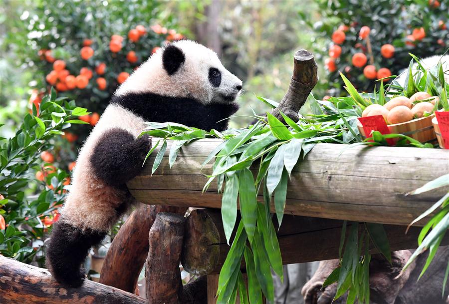 GUANGDONG, enero 29, 2019 (Xinhua) -- El cachorro de panda gigante Long Zai se alimenta de una comida especial en el Parque Safari Chimelong, en Guangzhou, capital de la provincia de Guangdong, en el sur de China, el 29 de enero de 2019. Los dos cachorros, nacidos en julio de 2018, disfrutaron de un regalo especial de A?o Nuevo en el parque previo al Festival de la Primavera, que se celebra el 5 de febrero este a?o. (Xinhua/Liu Dawei)