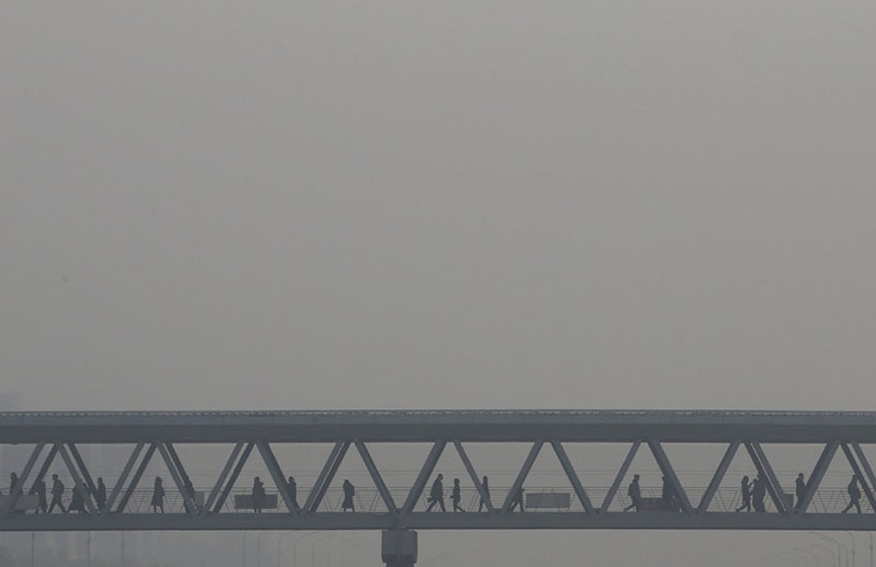 La gente camina en un puente peatonal envuelto en contaminación en Beijing, China, el 26 de noviembre de 2018. [Foto / Agencias]