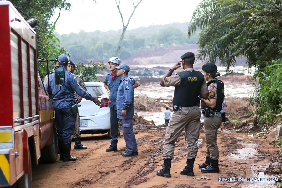 Imagen proveída por AGENCIA ESTADO de elementos de la Policía Militar conversando con elementos de la Policía Civil de Minas Gerais, en el lugar destruido tras la ruptura de una represa de residuos de la minera brasile?a Vale, en Brumadinho, ciudad en la región metropolitana de Belo Horizonte, capital regional de Minas Gerais, Brasil, el 25 de enero de 2019. Al menos siete muertos y 150 desaparecidos es el saldo preliminar de rupturas de represa de la minera brasile?a Vale, la mayor exportadora de hierro del mundo, en la región metropolitana de Belo Horizonte (sureste de Brasil), confirmó este viernes el gobierno del estado de Minas Gerais. (Xinhua/Telmo Ferreira/FRAMEPHOTO/AGENCIA ESTADO)